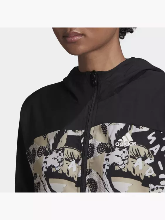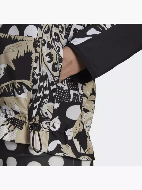 Ein Style für gute Laune! Lass dir vom ungemütlichen Wetter nicht die Stimmung verderben. Dieser adidas Windbreaker sorgt mit seiner auffälligen Grafik aus der Zusammenarbeit mit dem brasilianischen Label FARM Rio für positive, sommerliche Vibes. Kombinier ihn wie du magst zu deinem Yoga-Outfit, Jeans oder einem Kleid – er sorgt in jedem Fall für die Extraportion Style. Außerdem bietet er durch sein leichtes Material und die feuchtigkeitsabsorbierende AEROREADY Technologie ein bequemes Tragegefühl.Das Produkt ist Teil unseres Engagements gegen Plastikmüll und besteht zu 100 % aus recycelten Materialien.