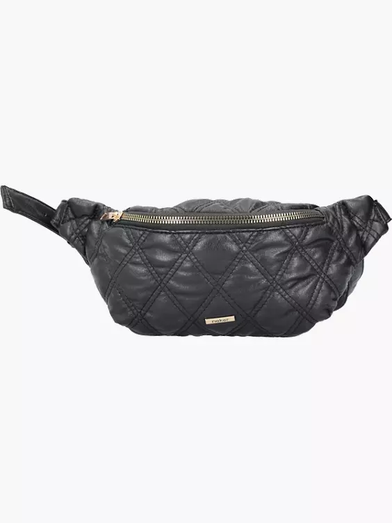 Ideal für unterwegs! Diese Gürteltasche von Rieker ist super praktisch und dazu ein top modisches Accessoire. Durch die Kombination aus schwarzem Textil und goldenem Reißverschluss ist die Tasche absolut zeitlos. Das Rautenmuster aus doppelten Ziernähten sorgt dabei für das gewisse Etwas.